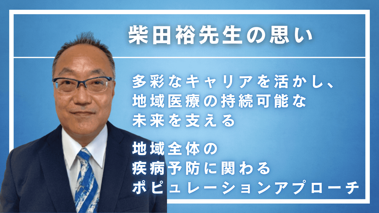 柴田先生 臨床医としてのキャリアでは、主に有病者の治療に向き合う「ハイリスクアプローチ」が中心でした。しかし今後は、地域全体に関与して疾病を予防する「ポピュレーションアプローチ」にも力を入れていきたいと考えています。