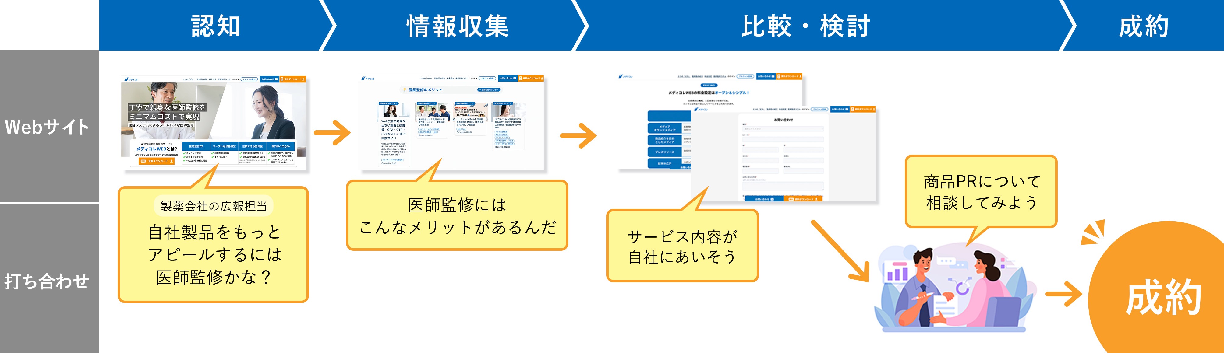 以下は、メディコレのコンバージョンに至るまでのカスタマージャーニー例です。