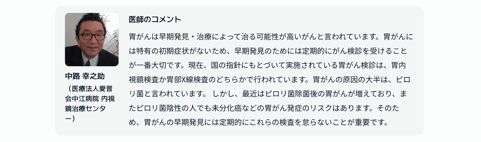 また、胃がんの検査に関する解説記事では、消化器領域を専門とし、内視鏡検査・内視鏡治療に長年携わっている医師が監修しています。