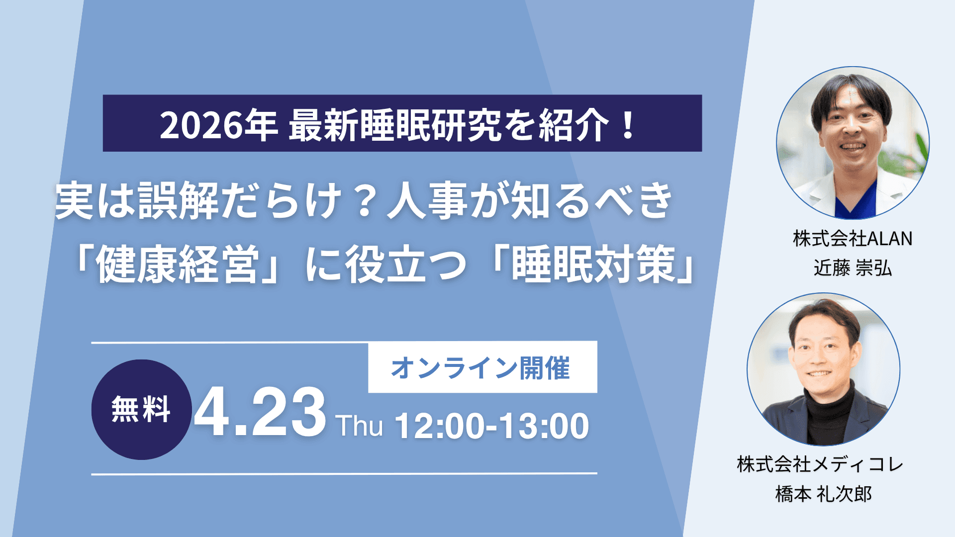 2026年4月23日(木)、株式会社メディコレと株式会社ALANの共催により、健康経営担当者・人事担当者・経営層を対象としたオンラインウェビナー「2026年最新睡眠研究のご紹介」を開催いたしました。